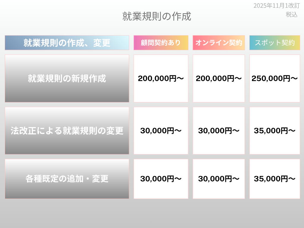 就業規則 本ページはプロモーションが含まれています。 2025年11月1日 近年、労働関係、特に雇用保険に関する法改正が頻繁に行われています。会社の就業規則が現行法に合致していない場合は、必ず改定をする必要があります。 また、当事務所では、法改正に対応するだけでなく、労働者の働き方の変化にも対応し、より労働者のモチベーションアップを図るご提案をして参ります。 御社の企業理念等をお伝えください。就業規則を改めて見直す事で、社会や事業変化への柔軟な対応により企業が持続的に成長するきっかけになると考えています。
