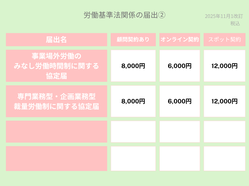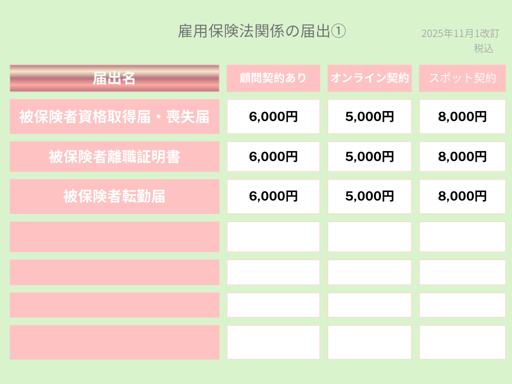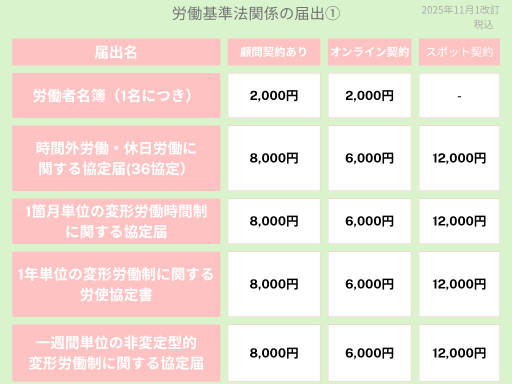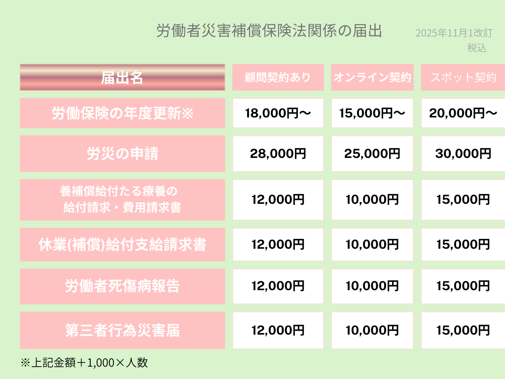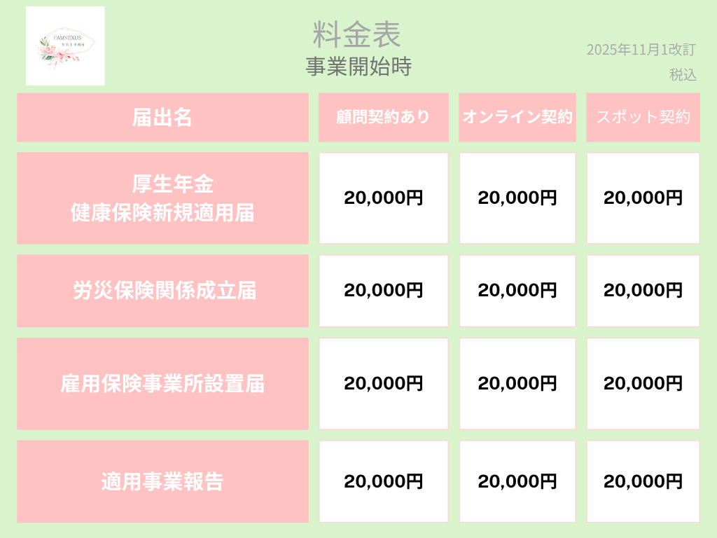 会社設立時、労働保険関係の手続料金表となります。