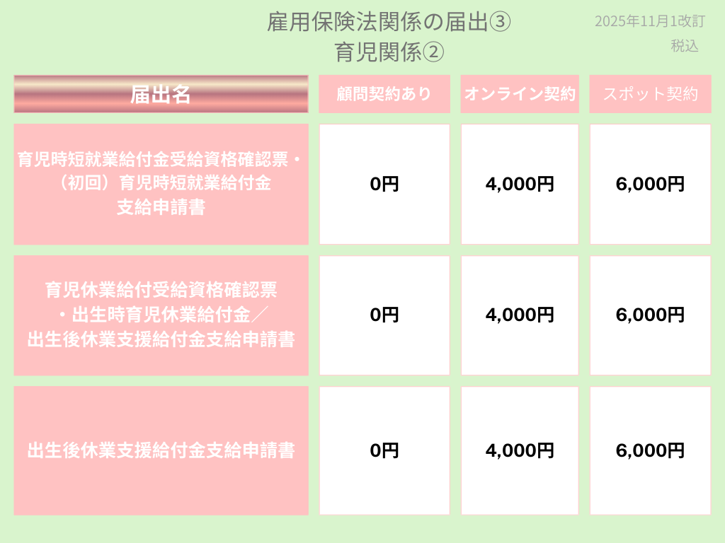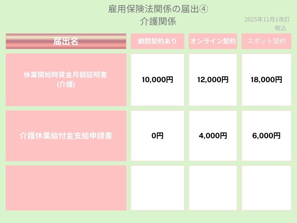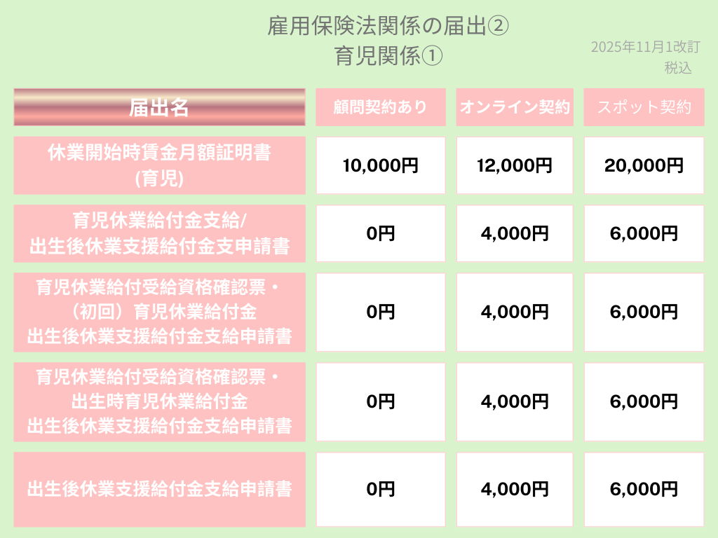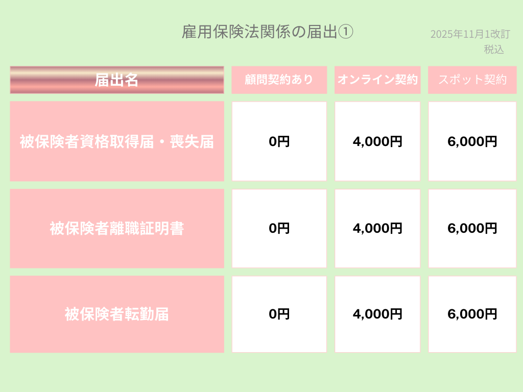雇用保険関係の届出 本ページはプロモーションが含まれています。 2025年12月1日 雇用保険の手続料金表となります。 労働基準法関係、労災保険法関係の手続料金表はこちらになります。 健康保険法関係の手続料金表はこちらになります。 契約形態により料金が異なりますのでご確認下さい。別途セット割引も適用致しますのでまずはご相談下さい。